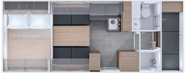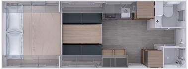 Mit über 25 sorgfältig entwickelten Layouts umfasst unser Sortiment verschiedene Modullängen von 4100 mm bis 7400 mm, sowie drei unterschiedliche Grundriss-Typen. Typ A: Kombiniertes Bad und WC für eine effiziente Raumnutzung. Typ B: Getrennte Dusche und Toilette für zusätzliche Privatsphäre. Typ C: Einzigartiger Essbereich-Grundriss für ein neues Raumgefühl.