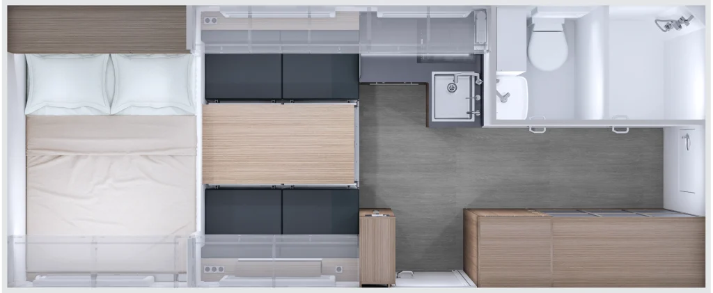 Das Interieur des Wohnkabine ist modern und ansprechend. Das Design fokussiert sich auf Funktionalität und ist auf Langstreckenreisende abgestimmt. Es gibt eine große Auswahl an Materialien, um dein Modul ganz nach deinem Geschmack zu gestalten.