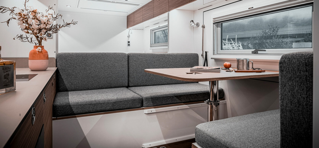 Der Essbereich kann einfach durch das Umbauen des Tisches zu einem weiteren Schlafbereich umgebaut werden.