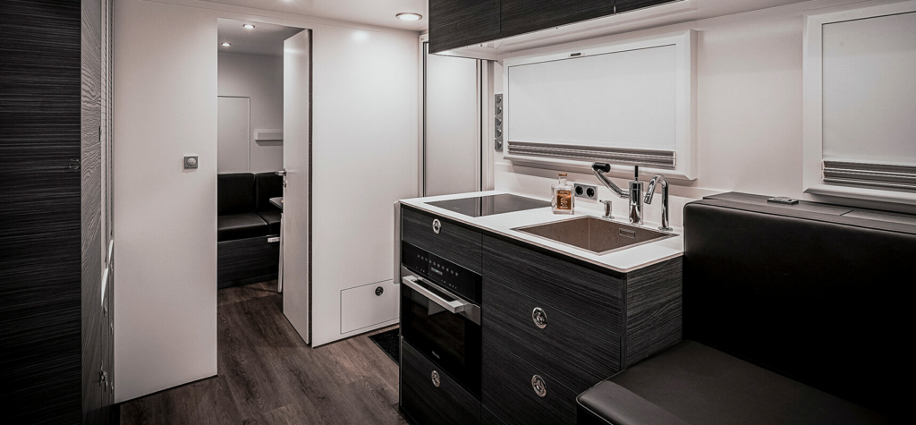 Eine voll ausgestattete, schnell einsatzbereite Küche, die in eine Außen-Staubox integriert ist. Inklusive einen Elektrogrill, ein Induktions- oder Kontaktkochfeld und eine Spüle mit gebrauchsfertigen Wasseranschlüssen.