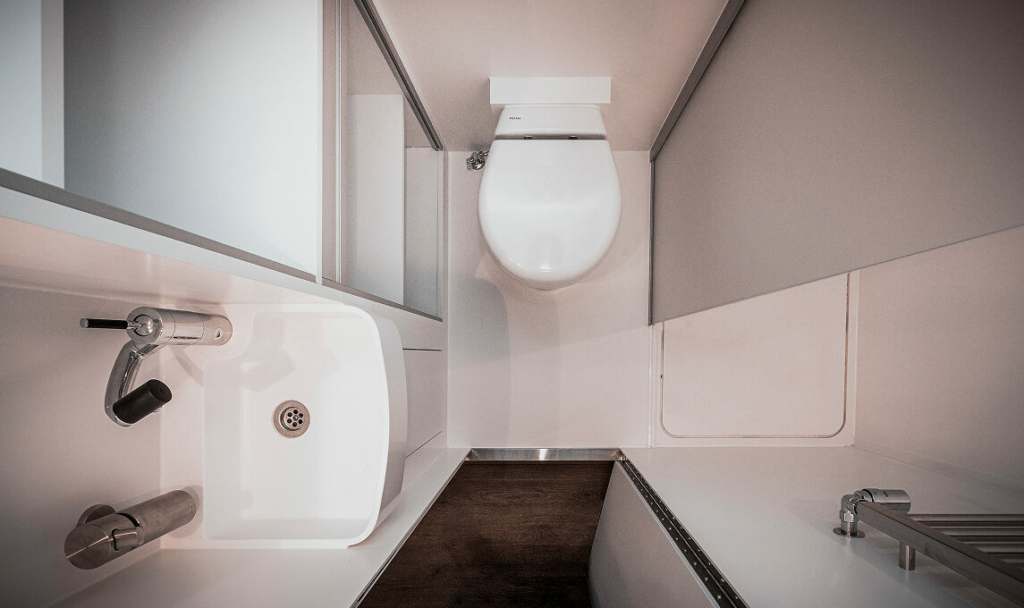 Keramik Zerhacker-Toilette in Yachtqualität. Schwarzwassertank mit einer externen Belüftung über einen Aktivkohlefilter und einer Spülpumpe, die das Wasser aus dem Grauwassertank zum Spülen in den Schwarzwassertank pumpt.