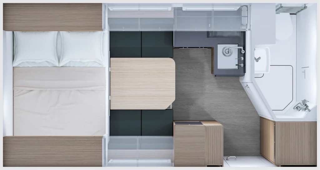 Das Interieur des Wohnkabine ist modern und ansprechend. Das Design fokussiert sich auf Funktionalität und ist auf Langstreckenreisende abgestimmt. Es gibt eine große Auswahl an Materialien, um dein Modul ganz nach deinem Geschmack zu gestalten.