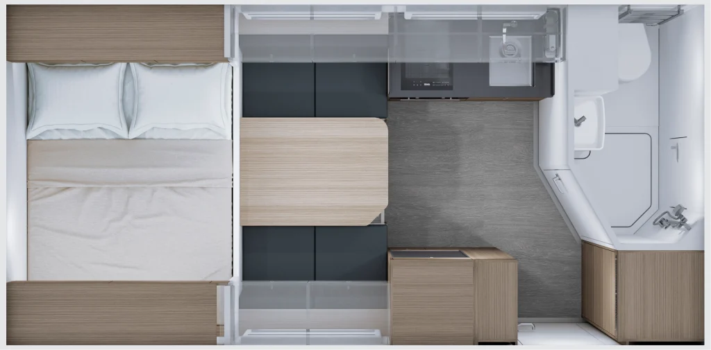 Das Interieur des Wohnkabine ist modern und ansprechend. Das Design fokussiert sich auf Funktionalität und ist auf Langstreckenreisende abgestimmt. Es gibt eine große Auswahl an Materialien, um dein Modul ganz nach deinem Geschmack zu gestalten.