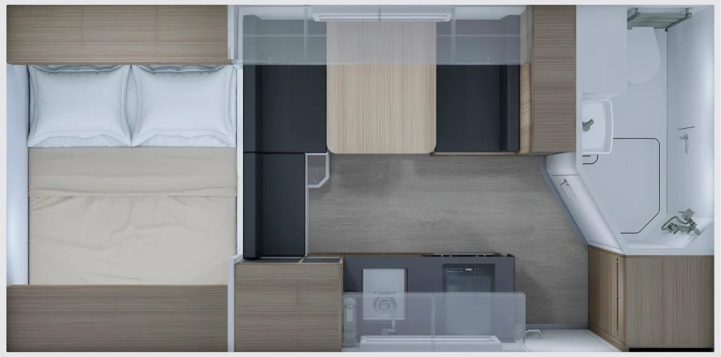 Das Interieur des Wohnkabine ist modern und ansprechend. Das Design fokussiert sich auf Funktionalität und ist auf Langstreckenreisende abgestimmt. Es gibt eine große Auswahl an Materialien, um dein Modul ganz nach deinem Geschmack zu gestalten.