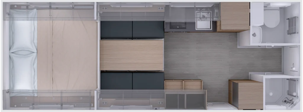 Das Interieur des Wohnkabine ist modern und ansprechend. Das Design fokussiert sich auf Funktionalität und ist auf Langstreckenreisende abgestimmt. Es gibt eine große Auswahl an Materialien, um dein Modul ganz nach deinem Geschmack zu gestalten.