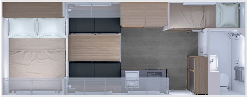 The table top surface is given the same finish as the other furniture surfaces. The seating bench upholstery is fabric as standard, or can be upgraded to leather, with both options available in any colour of your choice. The water tanks and the modular Powerbox (that provides the energy supply for the module) are located underneath the seats.